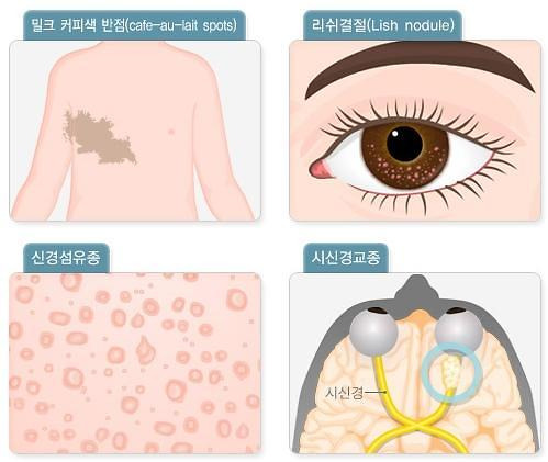 - 카페오레 반점(밀크커피색 반점): 피부에 연한 갈색 반점이 다수 발생