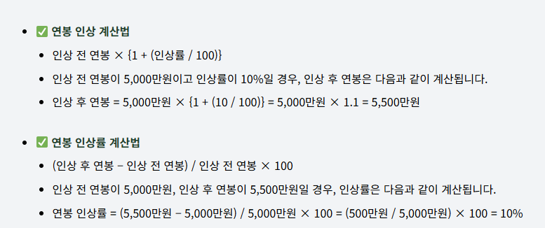 인상률(%) = (인상 후 연봉 - 기존 연봉) ÷ 기존 연봉 × 100
