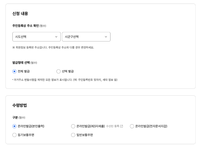 | 선택 가능 항목 | 주민번호 뒷자리, 과거주소 포함 여부 등 | 발급 시 선택 |