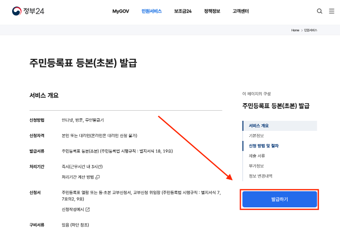 - 상단 메뉴 → [민원서비스] → [주요서비스] → 주민등록표등본(초본) 교부 클릭
