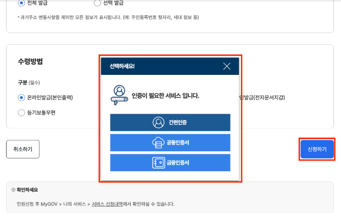 - 본인 인증 (간편인증, 공동·금융 인증서, 휴대폰 인증 중 선택)