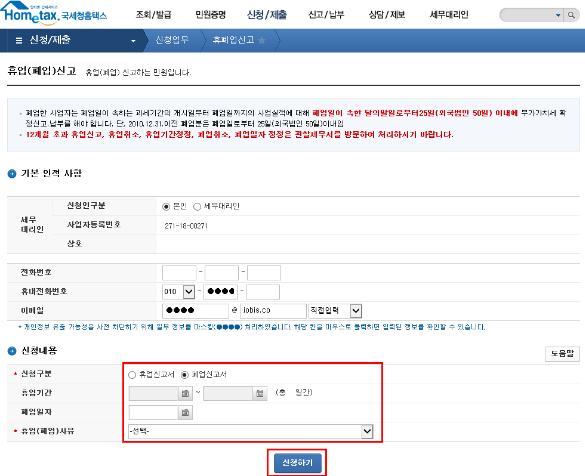 - 로그인 → [휴·폐업신고] 메뉴 클릭