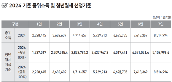 - 청년 본인 소득: 기준 중위소득 60% 이하