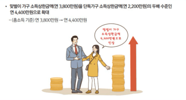 - 맞벌이 가구 기준 상향 (4,400만 원)