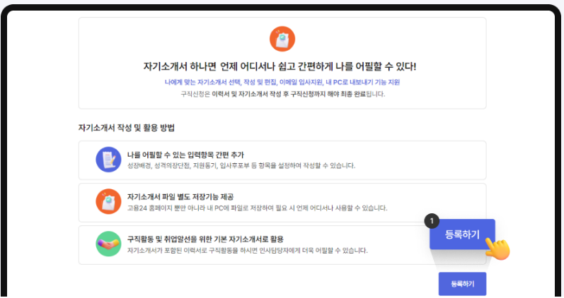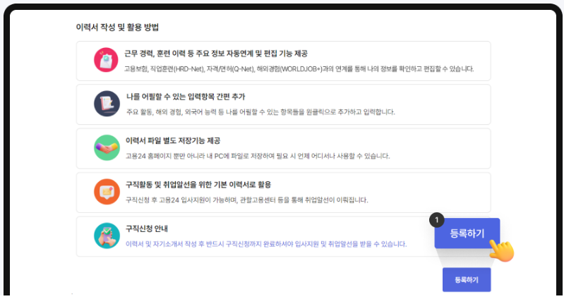 - 이력서 작성 및 구직등록 (고용24 내에서 진행)