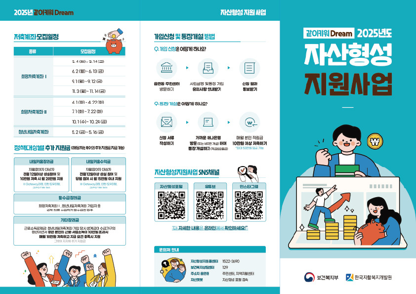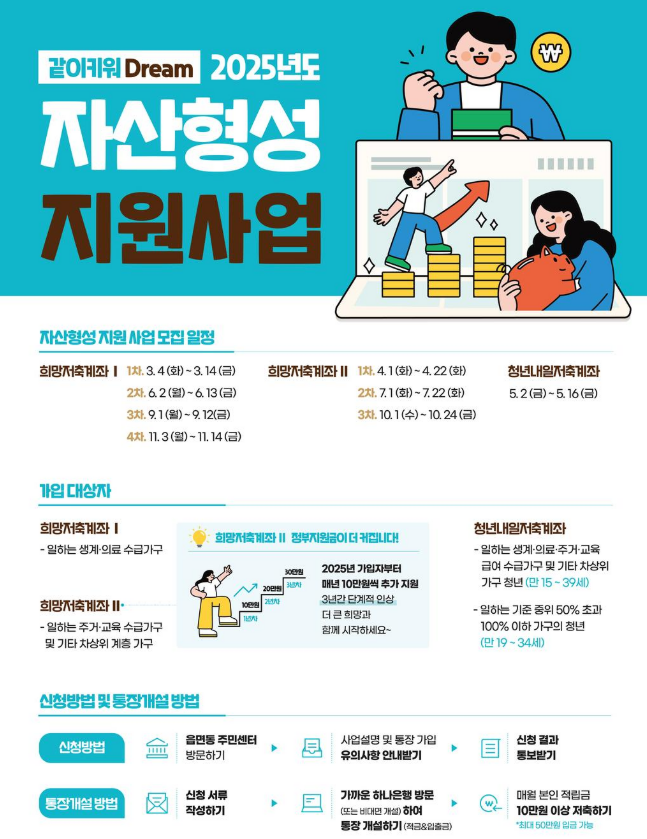 - 신청: 2025년 5월 2일~5월 21일 복지로/자산형성포털 온라인 또는 읍면동 주민센터