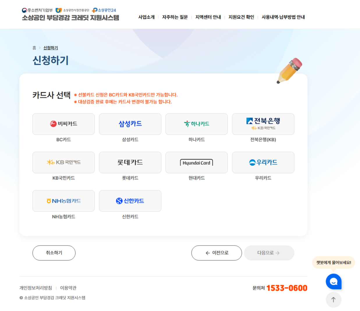 - 카드사 선택(총 8곳 중 택1, 신청 후 변경 불가)