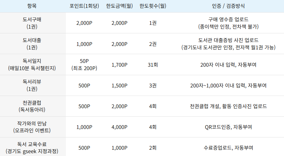 | 도서 구매 | 2,000p | 월 1권, 영수증 인증 |