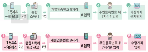 - 홈택스에 등록한 본인 계좌로 입금되며, 완료 시 문자로 통보됩니다.