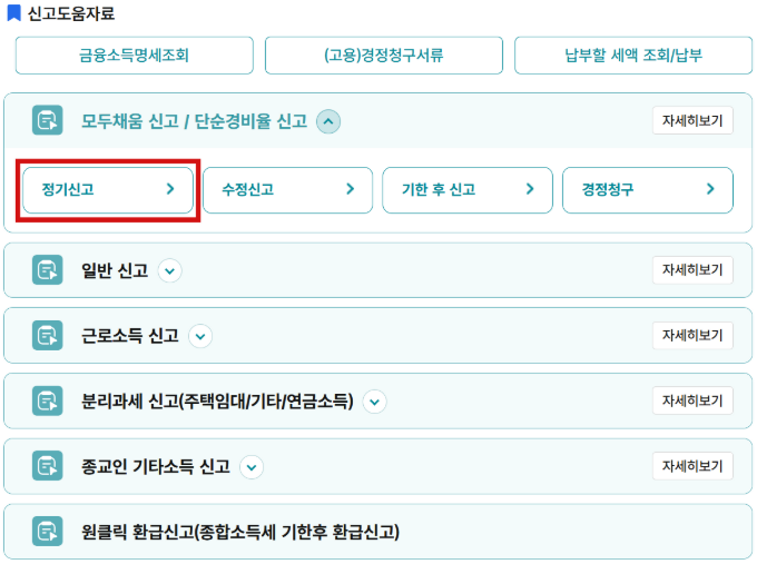 - 경로: [신고/납부] → [종합소득세] → [정기신고]