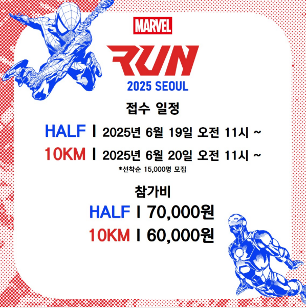 | 마블런 2025 | 2025년 9월 14일 | 서울광장 | 하프마라톤 / 10km | 선착순 15,000명 |