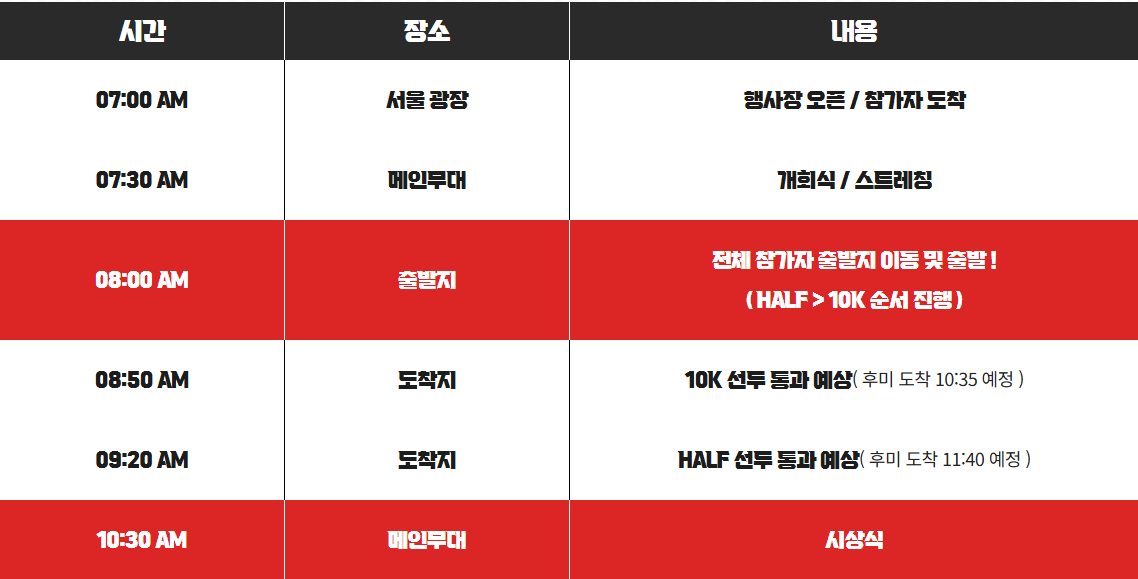 - 하프마라톤(21.1km): 체력 도전형, 기록 측정 넷타임 적용