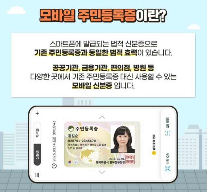 모바일 주민등록증은 기존 실물 주민등록증과 동일한 법적 효력을 가진 디지털 신분증입니다.