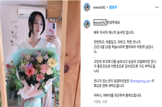 그녀의 사망일은 2025년 6월 20일, 하지만 공식적인 부고는 7월 1일 소속사 매니저를 통해 SNS 인스타그램(@eseoe242) 계정을 통해 전달되었습니다.