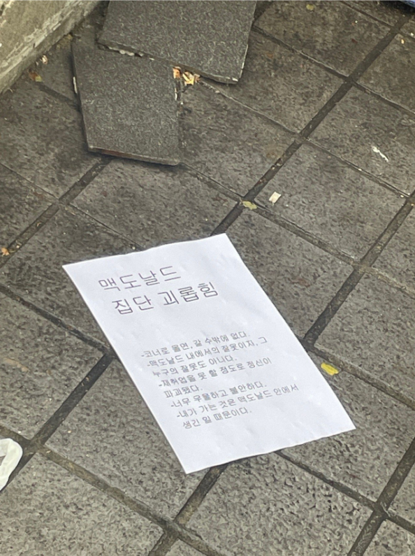 맥도날드 숭실대점에서 근무하던 40대 남성 A씨는, 자신이 겪은 괴롭힘과 고통을 담은 인쇄물과 유서를 남긴 채 극단적인 선택을 했습니다.