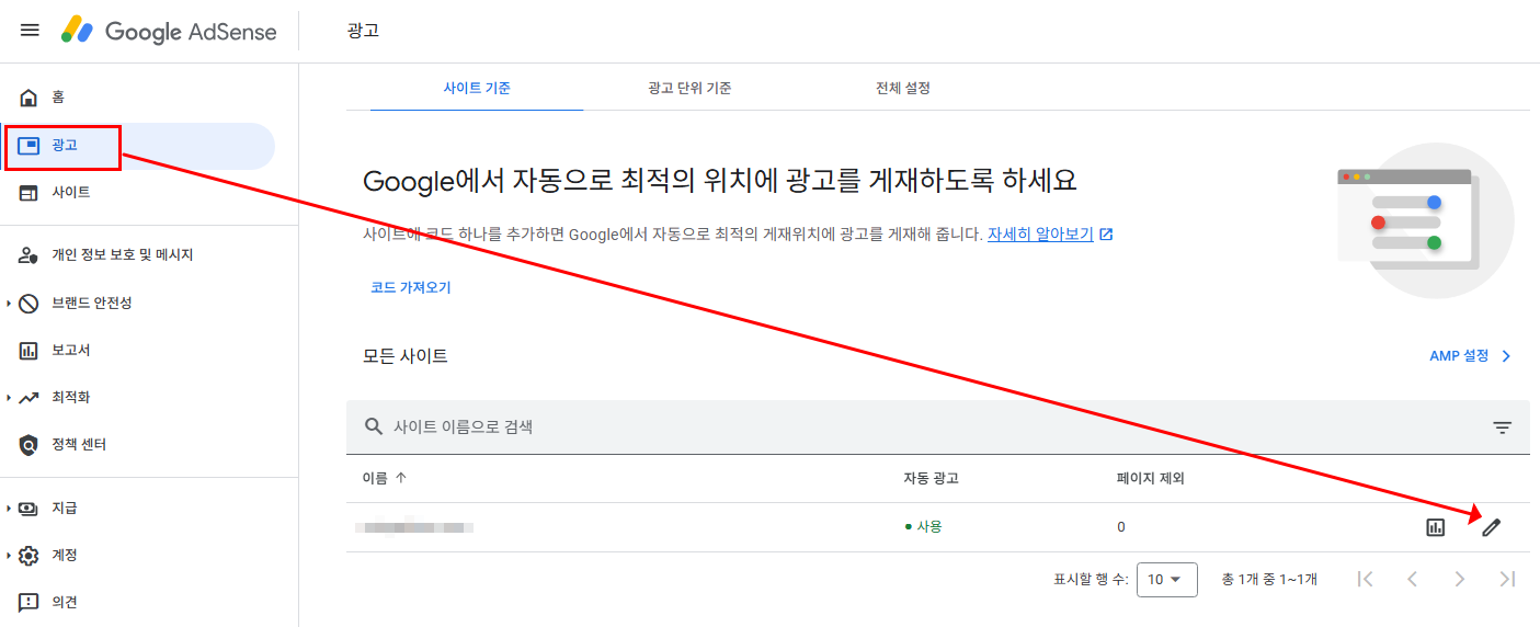 - 사이트 목록에서 티스토리 주소 옆의 연필 아이콘(편집) 선택