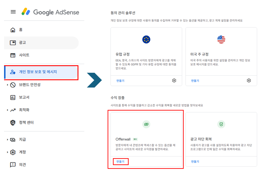 - 애드센스 관리자 → ‘개인정보 보호 및 메시지’ 메뉴 이동