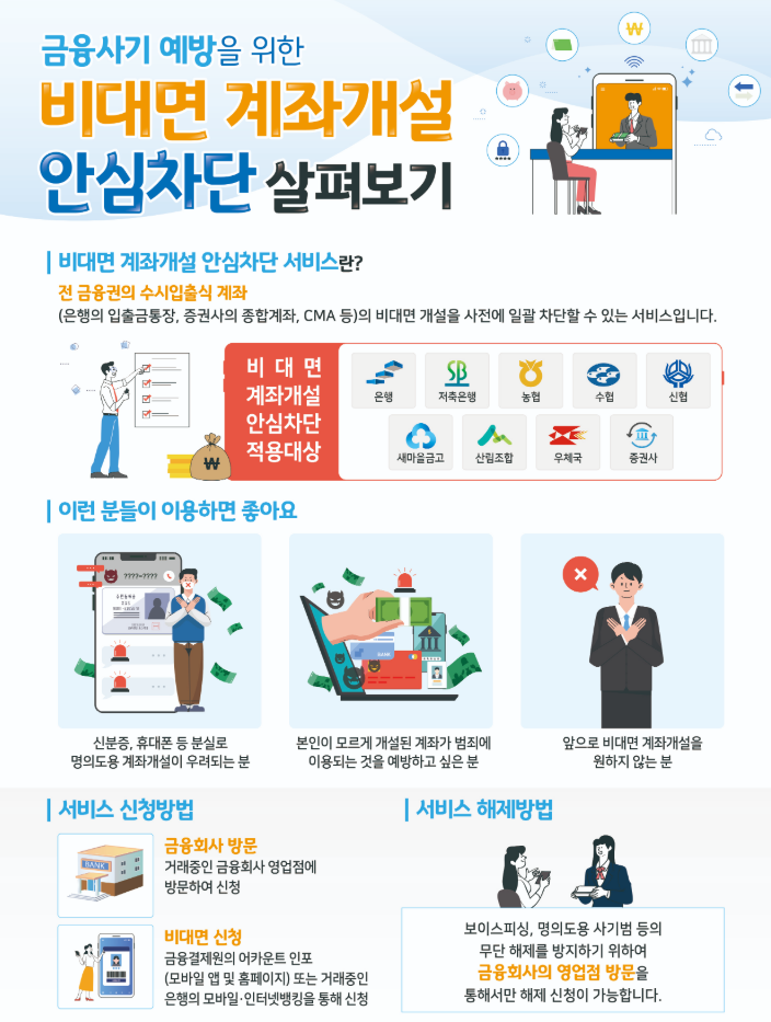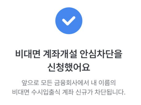 - 신청 즉시 모든 금융권(은행, 증권사, 저축은행 등)에서 비대면 신규 계좌 개설이 차단됩니다.