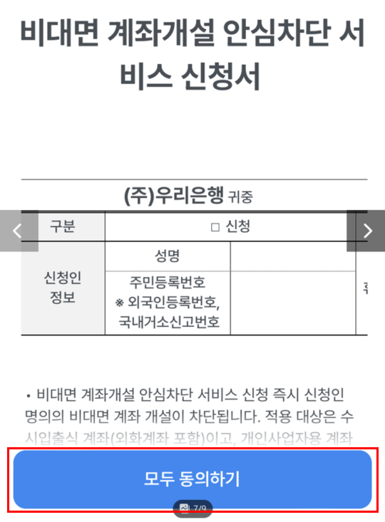 우리은행 포함 모든 금융기관에 한 번에 비대면 계좌개설 차단을 설정할 수 있습니다.